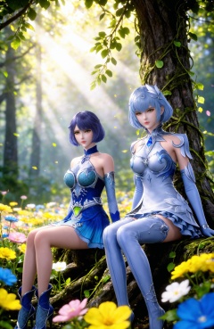 <lora:斗罗大陆-独孤雁+叶泠泠IL:0.7> 2girls, short hair, hair ornament, dress, thighhighs, bare shoulders,blue hair, short dress,elbow gloves, white dress, blue dress, high heels, thigh boots, boots, blue footwear,, 1girl, flower, sitting, blurry, yellow flower, blurry background, outdoors, sunlight, looking at viewer, nature, depth of field, arms at sides, leaf, tree, light rays, plant, feet out of frame, day,