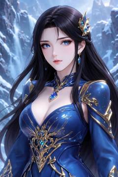 <lora:20260210_TinFlux2KleinAnimeLora2:1>, This is a highly detailed, digital anime-style artwork of a beautiful, young, fair-skinned woman with long, flowing, dark brown hair adorned with gold and blue ornate headpieces. She has striking, large blue eyes with a gentle, almost melancholic expression. She wears an elaborate, blue and gold armored outfit with a low-cut top that accentuates her ample cleavage, and a blue gemstone pendant at her collar. The background features a serene, icy landscape with cascading waterfalls and snow-covered rocks, adding a sense of fantasy and elegance to the scene. The lighting is soft, highlighting her flawless skin and the intricate details of her attire.