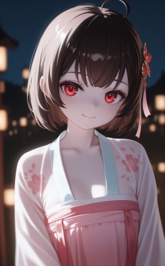 masterpiece,absurdres,best quality,((petite)),loli,high quality,chromatic_aberration,shiny_skin,//,Cool color theme,loli,mmd Style,night,1girl,solo,red eyes,hanfu,looking at viewer,hair ornament,short hair,upper body,brown hair,blurry,ahoge,bangs,see-through,depth of field,hanfu,smile,floral print,closed mouth,pale_skin,fair_skin,depth_of_field,Volumetric Lighting,Cinematic Lighting,background light,Tyndall effect,//,