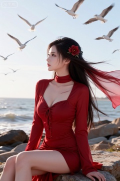 1女孩,独奏,长发,衬衫,红色衬衫,黑发,发饰,**,中等胸部,花朵,露脐,发花,指甲油,疤痕,宽领,前系式上衣,坐着,坐在海边的石头上,(风拂过长发和围巾),天空中有许多鸟儿飞翔,飘动的头发