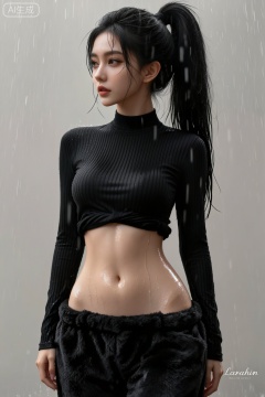 一个年轻的美女穿着一件黑色罗纹长袖上衣,黑色低腰毛绒裤。高马尾。在雨中,全身湿透,皮肤反射着光泽。