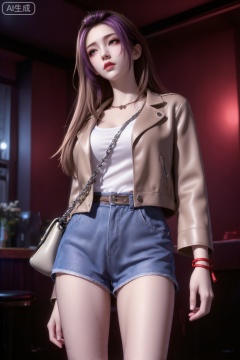 低角度仰视特写,东亚年轻女性侧身立于酒吧街暗角。米色短款皮夹克敞开,内搭白色背心,牛仔短裤下双腿修长,链条包斜挎。棕色长发凌乱垂落,鬓边碎发轻贴脸颊。头微向左转,含情杏眼在昏暗中泛起朦胧眼神光,浅妆面容在伦勃朗光与灰蓝强侧光交织下轮廓深邃,锁骨线条清晰。手腕红线吊饰垂落,光影自然渐变,多源环境光造成面部光影深浅不一。背景墙边弥漫暗红微光,整体曝光明暗对比强烈,暗部保有细腻噪点,凸显清冷纯欲气质。画面略带动态模糊,以轮廓光勾勒身形,突出葫芦形曲线与氛围感。