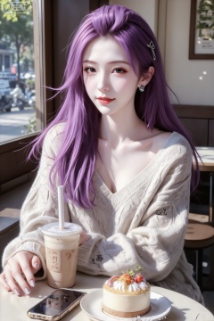 高清画质,真人摄像,专业拍摄。她坐在店内,桌上放着奶茶和一块精致慕斯蛋糕一个手机一个包,姿态自然;女生身穿v宽松大牌编织毛衣,佩戴耳钉,做了裸色美甲;这是一家有透明咖啡店,整体氛围清新日常,充满城市街头的生活感。运用伦勃朗光,极致清晰,明暗对比度高,侧方树叶斑驳阳光光影落在身上,脸部光影稍弱一点,电影质感。(电影级面光:1.6),(光线追踪:1.5),(冷白皮漫感质感的光滑皮肤:1.7),(人物有最好的骨相:1.2),(网感脸:1.6),(网感妆:1.6)身材完美,莫兰迪配色,高颜值网红,INS风,幼态脸,19岁女生尖下巴,三庭五眼比例均衡,身材娇小,细腻陶瓷水嫩肌肤,偏冷白皮,随机的妆容,随机的饰品,随机的动作,侧光,发丝轻飘,凌乱,随机角度拍摄,总体有很多的不确定性,但又好看,