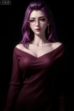 红酒色斜肩宽领长袖上衣,头部全呈现,律师大姐姐,金丝无框眼镜上有链子,高贵,优雅,上流,英姿飒爽,极致美艳,**,御姐,表情害羞,眼神迷离,媚眼如丝,极致打光,顶级调色, 氛围光,伦勃朗光,强烈明暗对比,高反差,紫色波浪中长发,高傲,法则,真实,肌理质感,情感张力,情绪氛围感拉满,奇特视角,顶级清晰度朦胧美学,层次感,大师构图,获奖作品