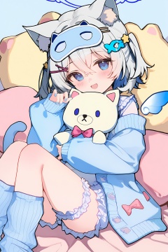 high resolution,aesthetic,excellent,medium resolution,newest,year 2025,<lora:nai4-ckxl0.2-000031>,sleep mask,1girl,stuffed toy,animal ears,stuffed animal,blue eyes,mini wings,hair ornament,detached wings,sleeves past wrists,mask on head,tail,ers,animal ear fluff,cat girl,blue cardigan,wings,cat tail,cat ears,long sleeves,socks,x hair ornament,mask,cardigan,looking at viewer,halo,puffy long sleeves,solo,lying,open mouth,blue socks,white ers,hairclip,open cardigan,on back,eye mask,white wings,feet out of frame,frilled shorts,teddy bear,blush,knees together feet apart,grey hair,holding stuffed toy,loose socks,puffy sleeves,open clothes,smile,bed sheet,ice cream,underwear,stuffed cat,hair between eyes,shirt,fish hair ornament,crossed bangs,crescent,short hair,food,crescent hair ornament,two side up,hugging object,pink bow,star hair ornament,white shirt,blue nails,knees up,jacket,hand up,blue wings,blue jacket,heart hair ornament,blue hair,bridal garter,:d,bow,loli,