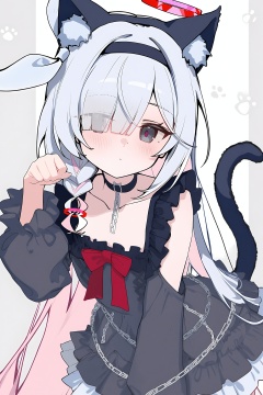 high resolution,aesthetic,excellent,medium resolution,newest,year 2025,<lora:nai4-ckxl0.2-000031>,1girl,red halo,animal ears,plana \(blue archive\),solo,cat ears,halo,long hair,black eyes,colored inner hair,black dress,long sleeves,black choker,closed mouth,black hairband,dress,tail,cat tail,choker,multicolored hair,blush,pink hair,braid,looking at viewer,paw pose,hair over one eye,animal ear fluff,white hair,single braid,hairband,chain,kemonomimi mode,grey hair,frills,collarbone,bow,alternate costume,pink halo,eyes visible through hair,cat girl,two-tone hair,red bow,