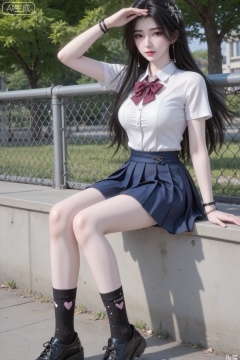 真实摄影,亚洲美少女薇薇,穿着白色短袖衬衫(配酒红色领结)、藏蓝色百褶裙,搭配黑色中筒袜(带小爱心图案)黑色皮鞋,手腕戴黑色手链;倚靠在铁丝网上,一手抬至额前,背景是绿树、铁丝网与户外场景,整体风格日系校园风,充满青春活力与夏日的氛围美感,倾斜构图,薇薇容颜绝美,正面照,超清晰画质,妆造精致,饰品精巧,可爱妆造,温柔大方,五官精致,面部清晰,(电影级面光:1.6),(光线追踪:1.5),(冷白皮漫感质感的光滑皮肤:1.7),(人物有最好的骨相:1.2),(网感脸:1.6),身材完美,莫兰迪配色,高颜值网红,INS风,幼态脸,19岁女生尖下巴,三庭五眼比例均衡,身材娇小,细腻陶瓷水嫩肌肤,偏冷白皮,随机的妆容,随机的饰品,随机的动作,侧光,发丝轻飘,凌乱,随机角度拍摄,总体有很多的不确定性,但又好看, 风格甜美少女系,氛围慵懒俏皮,东方美女,黑长直,年轻娇小,发丝呈现出自然的蓬松感与垂坠感,长发散落于肩头两侧,几缕发丝拂面,冷白皮气质美女,薇薇纯欲风,皮肤白皙,偶像气质,fairskin,气质的江南美女子,有点甜美,皮肤美白透亮,表情可爱,甜美氛围,细腻笔触,独特韵味的美,可爱表情