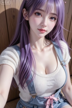 白色针织短袖上衣,浅蓝牛仔背带裤配粉色丝带装饰,细项链带小吊坠,木质纹理背景墙,自拍视角,柔和室内光,高清写实,面部细节清晰,(电影级面光:1.6),(光线追踪:1.5),(冷白皮漫感质感的光滑皮肤:1.7),(人物有最好的骨相:1.2),(网感脸:1.6),(网感妆:1.6)身材完美,莫兰迪配色,高颜值网红,INS风,幼态脸,19岁女生尖下巴,三庭五眼比例均衡,身材娇小,细腻陶瓷水嫩肌肤,偏冷白皮,随机的妆容,随机的饰品,随机的动作,侧光,发丝轻飘,凌乱,随机角度拍摄,总体有很多的不确定性,但又好看, 风格甜美少女系,氛围慵懒俏皮,东方美女,年轻娇小,冷白皮气质美女,纯欲风,皮肤白皙,偶像气质,fairskin,气质的江南美女子,有点甜美,皮肤美白透亮,表情可爱,甜美氛围,细腻笔触,独特韵味的美,傲人身材,D cup,美颜全开,光滑雪白水嫩的皮肤