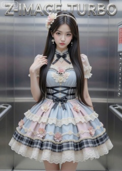 Extremely clear, cinematic quality. Image style: Utilizing high highlights and pure whites to create a visual focus, and leveraging contrasting light and shadow details to maximize emotional tension, ultimately achieving a "strong, sharp, and layered" visual impact. Image content: Long, straight black hair, large brown eyes, real photo, authentic, master-level image quality, top quality, high quality, black hair, long, slender legs, one girl, just a casual snapshot. The photo, slightly blurred, showcases a wild beauty: delicate features, a slender face, large eyes, a high nose bridge, cherry lips, a pointed chin, a slender model figure, and long, flowing black hair. It exudes a high level of beauty, ethereal and graceful, naturally fresh, like under the moonlight. The hair accessories and earrings add a touch of vulnerability, a hint of happiness. High scores and likes are highly recommended. The photo has a strong visual impact, a slightly tired, dependent look, a gentle touch on the shoulder, chest, a reluctant appearance, and long hair cascading down to cover the face and chest. The wearer is dressed, slender yet confident. The photo is in 8K ultra-high definition, a front-facing shot, a mirror, and an elevator. The high-necked dress features a main color scheme of light blue, light pink, and beige, with a multi-layered and complex design. The dress is adorned with three-dimensional flowers and lace, and patchwork black and white checkered fabric. The waist is decorated with black crisscrossing straps and a bow. The dress is richly layered, showcasing a luxurious and exquisite feel. Accessories include a headpiece adorned with pearls and flowers, echoing the style of the dress. The overall design exudes the luxury and dreamlike atmosphere of Lolita fashion. The text "Z-IMAGE-TURBO" is displayed at the top of the background with a silver, stainless steel effect.