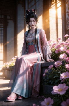 <lora:剑来2-稚圭IL:0.7> 1girl, black hair, long hair, necklace, hair bun, hair ornament, earrings, pink dress, chinese clothes, see-through, long sleeves,sash,pink footwear,, realistic style photo,outstanding style,Use soft lighting to cast gentle shadows on the subject,adding a touch of dimension to your images without compromising details,whirls of vapor,(Anime:1.1),soft neon light,ethereal ambiance,delicate details,magical atmosphere,concept art,highly detailed,ultra-high resolution,32K UHD,sharp focus,best-quality,masterpiece,golden hour,unconventional supreme masterpiece,masterful details,temperate atmosphere,with a high-end texture,in the style of fashion photography,magazine style,Dynamic Angle,Dynamic posture,magazine style,Dynamic Angle,Dynamic posture,(cowboy_shot:1.2),eye trail,depth of field,cinematic lighting,lens flare,close-up,extreme aesthetic,(wlop:0.6),(honjou raita,lack,rella,wanke:0.5),masterpiece,best quality,good quality,newest,year 2025,very aesthetic,absurdres,Visual impact,A shot with tension,ultra-high resolution,32K UHD,sharp focus,best-quality,masterpiece,Emotionalization,unconventional supreme masterpiece,masterful details,temperate atmosphere,with a high-end texture,in the style of fashion photography,(Visual impact:1.2),giving the poster a dynamic and visually striking appearance,, stairs,pink flower,bare legs,toes,barefoot,blurry,sitting,full body,