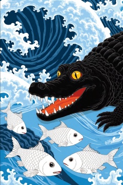 a large, black crocodile with sharp, visible teeth and an open mouth, positioned to the right. The crocodile has yellow eyes with black pupils and textured, scaly skin. Its head is angled towards the left. In the foreground, three white fish with detailed scales swim towards the bottom left. The background features dynamic, blue waves with white foam and wave patterns, creating a sense of movement. The crocodile's mouth is partially open, revealing its sharp, triangular teeth and orange inner mouth. The waves have varying shades of blue, with darker and lighter shades creating depth and texture. The fish are positioned in the lower left and middle of the image, moving towards the crocodile. The crocodile's eyes are directed towards the left, where the fish are located.