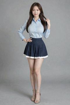A photograph of an Asian woman with long, straight, brown hair, standing against a plain gray background. She is wearing a light blue, long-sleeve button-up blouse with a fitted waist and a dark blue pleated skirt with white trim, accentuating her slim figure. Her skin tone is fair, and she is wearing beige high-heeled sandals. She has a confident smile, with one hand on her hip and the other touching her hair. The image is well-lit, emphasizing her youthful and professional appearance, long legs,