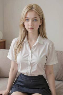 A fair-skinned young woman, likely in her late teens or early twenties, with long, straight, blonde hair that cascades down around her shoulders, framing her face. Her eyes are a striking light blue, and she gazes directly at the viewer with a neutral expression. She wears a cream-colored, short-sleeved collared shirt, unbuttoned at the top, paired with a dark navy blue skirt that reaches her knees. The shirt's fabric appears smooth, contrasting with the dark skirt's texture. The setting seems to be indoors, likely a well-lit room, possibly a minimalist design. A soft, even lighting source illuminates her face and hair. The background consists of a plain, neutral wall, a sofa, and parts of a wooden surface. The composition is a medium shot, framing her from the chest up, with the focus on her face and upper body. The atmosphere feels calm and gentle, suggesting a natural and realistic style. The overall tone leans toward a serene, somewhat dreamy quality.