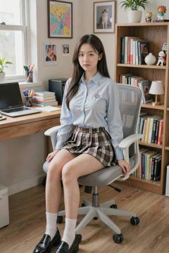 This is a high-resolution photograph featuring a young Asian woman seated on a white ergonomic office chair in a cozy, well-organized study room. The woman has long, straight dark brown hair cascading over her shoulders and a fair, smooth complexion. She is wearing a light blue, long-sleeved button-down shirt with a small embroidered emblem on the chest, paired with a short, high-waisted plaid skirt in shades of brown and white. Her outfit is completed with white ankle socks and black loafers. The background reveals a clutter-free, neatly arranged workspace. To her left is a wooden desk with a laptop, a stack of books, and a cup of pens and markers. Above the desk, a window allows natural light to flood the room, casting a soft glow. The walls are adorned with various framed pictures, including a colorful map, a photograph of a cat, and a few small decorative items. A wooden bookshelf to her right is filled with books, a small white ceramic lamp, and a few decorative figurines. The overall ambiance of the room is warm and inviting, with a blend of functionality and personal touches that suggest a blend of work and relaxation.