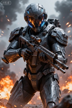 A highly detailed CGI image of a futuristic armored soldier in a sci-fi setting,wielding a rifle. The soldier,clad in metallic,segmented armor with glowing blue accents,has a reflective visor and is surrounded by intense,fiery explosions. The background is filled with smoke and flames,creating a dramatic,action-packed atmosphere.,