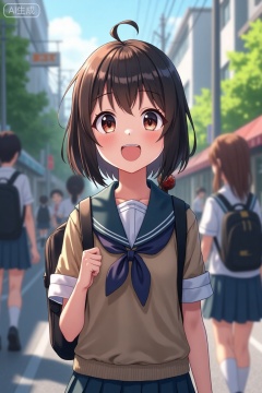 ((masterpiece)),((best quality)), 8k, high detailed, ultradetailed,a cheerful high - school student in Japanese school uniform with distinct body contours in mid - shot,a high - school student,(Japanese school uniform),(distinct body contours),cheerful expression,open collar,rolled - up sleeves,backpack,busy street in background