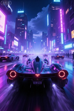 Cyberpunk realism.,It depicts a high-speed,futuristic car driving through a neon-lit city at night. Shot in a vibrant dynamic digital art style,the image shows a sleek black aerodynamic race car with a prominent streamlined body and LED taillights. The car,license plate number S216,appeared to be in motion,with faint tire marks and a noticeable sense of speed,suggesting it was driving on a race track or a busy city street. In the background,towering skyscrapers and countless colorful neon signs create a lively,vibrant atmosphere. The night sky was dark with some clouds,and the city's lights included bright purples,pinks,blues and whites,adding a vibrant contrast to the scene. The overall composition emphasizes movement and excitement,with the sharp angles of the racing cars and the reflective surfaces of the city adding to the futuristic and high-tech feel. The paint on the body reflects the lights of the city,and the blurred motion enhances the sense of speed and movement.,