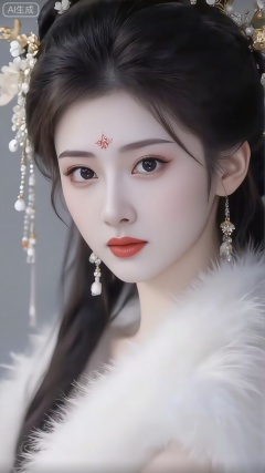 Chinese aesthetics, ethnic style, texture, mature woman, short hair, long straight hair, flowing long hair, Chinese clothing, silver white cheongsam, Dunhuang pattern cheongsam, white fluffy mink coat, phoenix eyes, close-up of the face, pale red lips, delicate, gangster boss style, female lead, extraordinary elegance, delicate hair clip, seductive, cold, lazy, aesthetics, black hair