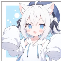 masterpiece, best quality, 1girl, :3, ahoge, animal ear fluff, animal ears, bangs, bare shoulders, black ribbon, blue background, blue eyes, blue headwear, blue theme, blush, blush stickers, border, bow, bubble, buttons, cat ears, cat girl, cat tail, closed mouth, collarbone, crossed bangs, dot nose, drawstring, dress, eyebrows visible through hair, fang, frilled dress, hair between eyes, hair ribbon, hands up, hooded jacket, jacket, long sleeves, looking at viewer, meme, off shoulder, on back, open clothes, open mouth, outside border, parted lips, pillarboxed, puffy long sleeves, ribbon, school uniform, shirt, short sleeves, sidelocks, simple background, sleeveless, sleeves past fingers, sleeves past wrists, smile, solo, stuffed toy, thighhighs, upper body, v, white background, white hair, white hoodie, white shirt, <lora:ShangCanglin01-000003:0.8>, jenlen01,