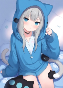 masterpiece,absurdres,best quality,petite,high quality,//,1girl,tail,grey_hair,cat_tail,blue_eyes,solo,hood,animal_hood,looking_at_viewer,virtual_youtuber,cat_ears,cat_girl,animal_ears,cat_hood,hood_up,blue_hoodie,long_hair,blue_nails,blue_jacket,hoodie,shirt,black_collar,:<,long_sleeves,choker,closed_mouth,collar,pajamas,paw_print,cat,sleeves_past_wrists,nail_polish,//,<lora:amashiro_natsuki ——【CKXL】hans:0.8>,