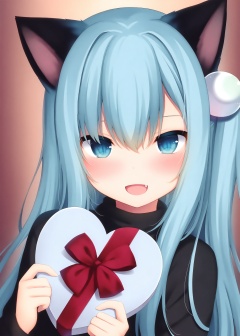 masterpiece,absurdres,best quality,petite,high quality,//,1girl, box, solo, animal_ears, heart-shaped_box, fang, blue_eyes, hair_between_eyes, smile, black_shirt, blue_hair, gift, cat_ears, gift_box, :d, shirt, looking_at_viewer, one_side_up, open_mouth, long_hair, holding_gift, blush, hair_ornament, holding, valentine, red_bow, bow, cat_girl, upper_body, portrait, slit_pupils//,<lora:amashiro_natsuki ——【CKXL】hans:0.8>,
