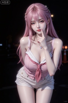 杰作级画质,顶级图像精度,超高清细节渲染,单人女性角色,(紫色亮丽的长发:1.4),(比例优越的纤细长腿:1.3),(肌肤白皙光滑的匀称美腿:1.4),(挺拔饱满的D 罩杯曲线:1.4),(精致立体的美颜五官:1.4),美颜全开,光滑油亮的皮肤,水嫩的肌肤,一个女孩,紫色头发(电影级面光:1.6),(光线追踪:1.5),(冷白皮漫感质感的光滑皮肤:1.7),(发丝暖光:1.5),(人物有最好的骨相:1.4),(网感日漫脸:1.6)(网感日漫妆:1.6),(带有项链:1.1),环境:夜晚户外,背景为黑色,点缀少量模糊灯光与交通锥,拍摄一名女生,一位粉色长发及腰、穿着服饰:日式粉色校服上衣,动作:戳脸,眨眼,贴近,营造夜间氛围感,因快门速度不足产生模糊,尽显生活中的绚丽日常。张力,露出肩、锁骨和吊带,与镜头互动感,浅色酷系短裤,长腿。