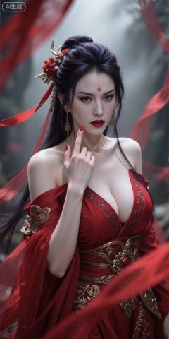 为中式怪诞风格。美丽而优雅神圣的不知火舞,红衣,慈悲中又有点邪性的,单手向着镜头勾勾手指,诱惑,仿佛伸出画面。脸部白皙皮肤光滑水嫩细腻,高雅的质感,斜眼看镜头,腼腆。飘渺神秘,红色丝带镜头前虚化借景,画笔厚涂,低饱和度,笔触纹理清晰,画面通过细腻的笔触和丰富的色彩层次塑造主体与场景,质感逼真,法天象地,表情高冷,服装华丽,复杂,奢华,唯美,充满压迫感,整体兼具艺术感,大透视,底光打在脸上,镜头仰视主体,悲天悯人,高高在上,圣洁高傲,清冷淡漠如梦如幻,氛围感。超广角强透视构图,张力十足,压迫感,细节生动完美。极其震撼的一幕,视觉冲击力强,光影彼此交织错杂的梦幻感,朦胧,明暗对比强烈,阴影过渡自然,电影级构图,视觉冲击,8K画质,超清,极致细节,清晰的线条,高对比,大师级别的作品。立体渲染,精细画笔,超细腻笔触,线条流畅,超清画质,完美品质,高质量,自适应饱和度,专业级打光,大师杰作,自由视角,阴影过渡自然,氛围感,高级感,意境,亮闪,唯美,宿命感拉满,弥散粒子,画面具有层次感。视觉冲击大,故事感,高级感,动态感。震撼,大师构图震撼人心。游戏感,强烈透视,震撼视觉,ue5渲染,命运史诗感,黑色风格,诺兰电影色调,浓雾,弥散,唯美辉光
