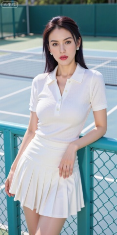 A high-fashion editorial portrait of a model in a minimalist all-white pleated tennis skirt and a technical knit polo. She is leaning against a teal blue tennis court fence. Soft morning sunlight, clean geometric lines of the court in the background. High-key lighting, pastel color palette, sophisticated and athletic aesthetic, professional lifestyle photography.