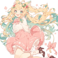 masterpiece, best quality ,1girl,, blonde hair, blue hair, blush, bow, dress, food, green hair, hair ornament, high heels, jenlen01, long hair, open mouth, pink bow, skirt, smile, socks, solo, tail bow, very long hair, white background, white shirt, detail eyes, <lora:ShangCanglin01-000004:0.8>,hide hands, cowboys shot, arms behind back, pov face,