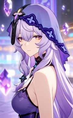 depth of field,masterpiece,best quality,very aesthetic,alternate costume,alternate costume,2024,2023,perfect composition,ultra-detailed,extreme aesthetic,masterpiece,best quality,good quality,newest,year 2024,year 2023,very aesthetic,absurdres,looking_at_viewer,colorful,long hair,multicolored hair,gradient hair,streaked hair,upper_body,<lora:黑天鹅·衣服百搭ILL:0.8>,black swan \(honkai: star rail\),purple hair,long hair,yellow eyes,veil,very long hair,hair between eyes,