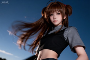 采用电影写真风格的摄影后期处理,呈现出高分辨率的画面效果。画面主体是一位身着灰黑色短体恤,有着亚麻棕色长头发的木之本樱cosplay人物。人物面对镜头,背景是一片蓝天。运用低视角、特写镜头和对角线构图,捕捉人物的特写姿态,带有动态模糊效果,增强画面的冲击力。整体画面为暗调,明暗交替对比,营造出简约而富有张力的氛围。