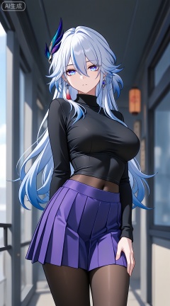 1girl,breasts,skirt,solo,pantyhose,large breasts,purple skirt,covered navel,long sleeves,taut clothes,miniskirt,pleated skirt,turtleneck,black shirt,shirt,black pantyhose,taut shirt,
