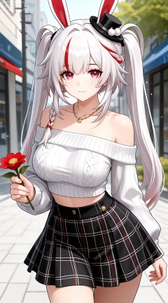 1girl,solo,skirt,off shoulder,off-shoulder sweater,jewelry,white sweater,holding flower,necklace,bare shoulders,holding,sweater,breasts,black skirt,plaid skirt,collarbone,plaid,blurry background,crop top,blurry,midriff,long sleeves,large breasts,