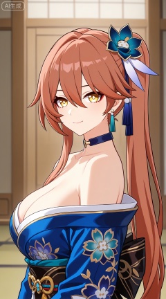 1girl,breasts,solo,japanese clothes,hair ornament,kimono,flower,hair flower,sash,blue kimono,large breasts,choker,looking at viewer,cleavage,bare shoulders,obi,off shoulder,earrings,smile,jewelry,floral print,closed mouth,makeup,from side,long sleeves,