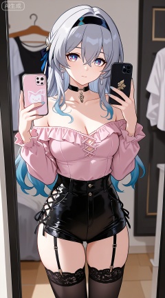 1girl,breasts,jewelry,phone,earrings,thighhighs,choker,solo,cleavage,cellphone,black choker,holding phone,bare shoulders,holding,smartphone,shirt,garter straps,black thighhighs,off-shoulder shirt,leotard,frills,selfie,collarbone,off shoulder,pink shirt,long sleeves,cross-laced clothes,standing,clothes hanger,closed mouth,cowboy shot,high-waist shorts,thighs,indoors,large breasts,see-through,shorts,medium breasts,