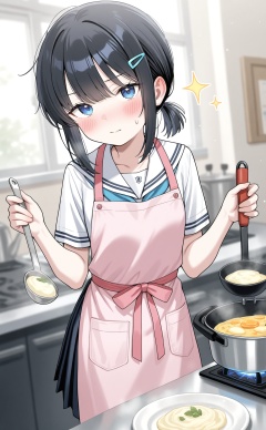 masterpiece,absurdres,best quality,((petite)),loli,high quality,chromatic_aberration,shiny_skin,//,1girl,solo,spoon,apron,black hair,holding spoon,school uniform,sailor collar,blue eyes,blush,blurry background,hair ornament,holding,serafuku,food,looking at viewer,white sailor collar,frills,hairclip,blue neckerchief,blurry,indoors,kitchen,cooking,pink apron,closed mouth,skirt,short sleeves,pleated skirt,neckerchief,sidelocks,short ponytail,ponytail,sweatdrop,collarbone,shirt,white shirt,stove,sparkle,frying pan,medium hair,cooking pot,hands up,black skirt,ladle,