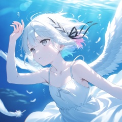 masterpiece,absurdres,best quality,((petite)),loli,high quality,chromatic_aberration,shiny_skin,//,1girl,underwater,solo,bubble,braid,ribbon,air_bubble,hair_ribbon,wings,dress,white_dress,hand_on_own_chest,arm_up,feathered_wings,white_hair,black_ribbon,short_hair,parted_lips,collarbone,white_wings,upper_body,bare_shoulders,feathers,submerged,blue_theme,sleeveless,caustics,angel_wings,spaghetti_strap,water,grey_eyes,sleeveless_dress,sidelocks,ribbon_braid,multicolored_hair,armpits,//,depth_of_field,pastel colors,subsurface scattering,blurry,game_cg,illustration,ultra detailed,hdr,(colorful),phenomenal aesthetic,detailed light,hdr,Tyndall effect,lens flare,Cinematic Lighting,