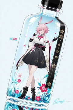 masterpiece,best quality,good quality,1girl,::,__artist__,year 2024,(blending:1.4),(limited palette:1.2),(no lineart:1.2),(flat color:1.2),(light blue background:1.2),(spot color:1.2),dutch angle,minimalism,silhouette,flat color,open mouth,no lineart,breasts,limited palette,signature,very awa,masterpiece,best quality,newest,highres,absurdres,<lora:add-detail-xl:0.8>,<lora:jijia-gnoobv-Tanger-000014:0.7>,jijia,2d,anime,1girl,solo,looking at viewer,in container,see-through,standing,hand up,character name,black background,reflection,copyright name,gradient,a glass bottle with a picture of a woman on it,a picture of a girl inside a clear container with a bunch of stuff in it,interval glass,inside the container,glass separation,<lora:Evanescia-ill-Tanger-000014:0.8>,Evanescia \(Honkai: Star Rail\),yae sakura,clothes: white shirt and black skirt,1girl,bangs,long sleeves,bow,long animal ears,pink hair,boots,japanese clothes,black gloves,bowtie,black footwear,high heels,fox ears,white jacket,purple eyes,