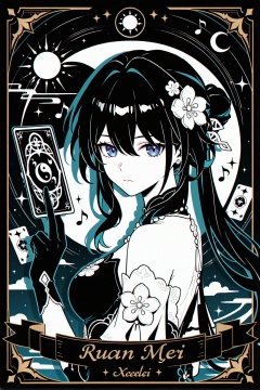 chihaya_anon,1girl,::,__artist__,year 2024,(drop shadow:1.4),(close-up:0.8),(shadow:1.2),(hands up:1.2),(border:1.2),(outside border:1.2),(hand up:1.2),(character name:1.2),from side,hand up,closed mouth,upper body,high contrast,frown,looking at another,looking at viewer,rope,portrait,drop shadow,sparkle,^ ^,flag,limited palette,moon,yin yang,bug,cloud,star (symbol),circle,silk,arrow (symbol),staff,(musical note),(((tarot card))),black theme,(((sun))),cube,crescent moon,flower,sunlight,colorful,very awa,masterpiece,best quality,newest,highres,absurdres,<lora:ruanmei_new-ill-Tanger-000014:0.8>,ruan mei \(honkai: star rail\),xuemei,clothes: xuemei qipao,pearl thigh strap,xuemei mismatched gloves,seele vollerei,1girl,bangs,blue eyes,xuemei hair ornament,gloves,bare shoulders,hair flower,holding fan,