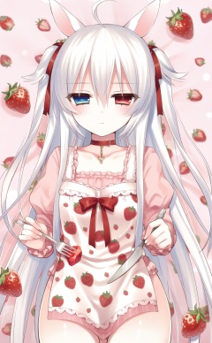 masterpiece,absurdres,best quality,((petite)),loli,high quality,chromatic_aberration,shiny_skin,//,1girl, solo, heterochromia, animal_ears, long_hair, fork, ribbon, white_hair, rabbit_ears, food_print, blue_eyes, two_side_up, red_eyes, strawberry_print, knife, strawberry, food, choker, ahoge, bow//,<lora:月影ネム——【CKXL】hans:1>,
