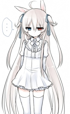 masterpiece,absurdres,best quality,((petite)),loli,high quality,white theme,//,1girl, heterochromia, animal_ears, long_hair, solo, white_hair, rabbit_ears, red_eyes, two_side_up, blue_eyes, ..., thighhighs, very_long_hair, dress, ribbon, spoken_ellipsis, ahoge, hair_ribbon, simple_background, white_background, zettai_ryouiki//,<lora:月影ネム——【CKXL】hans:1>,