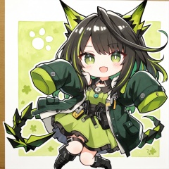 masterpiece, best quality, <lora:Mon3tr:0.8>,mon3tr \(arknights\), 1girl, sleeves past wrists, solo, green eyes, black footwear, chibi, fang, two-tone background, black hair, open clothes, jacket, boots, sleeves past fingers, multicolored hair, green hair, black jacket, :d, smile, animal ears, open jacket, green background, long sleeves, tail, full body, looking at viewer, green dress, dress, shirt, streaked hair, outline, white background, long hair, animal ear fluff, signature, green jacket, blush, open mouth, knee boots, traditional media ,