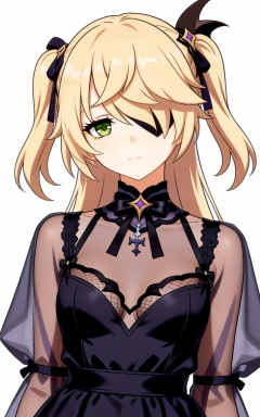 depth of field,masterpiece,best quality,very aesthetic,alternate costume,alternate costume,2024,2023,perfect composition,ultra-detailed,extreme aesthetic,masterpiece,best quality,good quality,newest,year 2024,year 2023,very aesthetic,absurdres,looking_at_viewer,colorful,white_background,simple background,upper_body,see-through,dress,<lora:菲谢尔·衣服百搭款ILL:0.8>,fischl \(genshin impact\),blonde hair,green eyes,hair_ornament,hair over one eye,eyepatch,two side up,black ribbon,black bow,long hair,