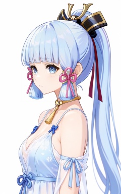 depth of field,masterpiece,best quality,very aesthetic,alternate costume,alternate costume,2024,2023,perfect composition,ultra-detailed,extreme aesthetic,masterpiece,best quality,good quality,newest,year 2024,year 2023,very aesthetic,absurdres,looking_at_viewer,colorful,white_background,simple background,upper_body,see-through,dress,<lora:神里凌华·衣服百搭款ILL:0.8>,kamisato ayaka,light bule hair,long hair,blue eyes,high ponytail,hair_ornament,hair ribbon,mole under eye,blunt bangs,