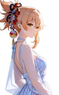 depth of field,masterpiece,best quality,very aesthetic,alternate costume,alternate costume,2024,2023,perfect composition,ultra-detailed,extreme aesthetic,masterpiece,best quality,good quality,newest,year 2024,year 2023,very aesthetic,absurdres,looking_at_viewer,colorful,white_background,simple background,upper_body,see-through,dress,<lora:宵宫·衣服百搭款ILL:0.8>,hair between eyes,yoimiya \(genshin impact\),blonde hair,yellow eyes,earrings,makeup,ponytail,