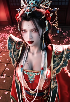masterpiece,best quality,amazing quality,high resolution,ultra-detailed,absurdres,(looking at viewer:1.1),upper body,(Dark room:1.3),(moody lighting:1.1),peach blossom,falling petals BREAK large breasts,chufuren,1girl,solo,hair ornament,jewelry,black hair,long hair,beads,earrings,forehead mark,necklace,red lips,chinese clothes,facial mark,hair flower,dress,bead necklace,red dress,makeup,brown eyes,realistic,lipstick,shoes BREAK photorealistic details,<lora:QQSillchufurenV1:0.8>,