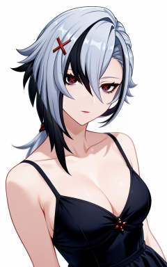 depth of field,masterpiece,best quality,very aesthetic,alternate costume,alternate costume,2024,2023,perfect composition,ultra-detailed,extreme aesthetic,masterpiece,best quality,good quality,newest,year 2024,year 2023,very aesthetic,absurdres,looking_at_viewer,colorful,white_background,simple background,upper_body,dress,<lora:仆人·衣服百搭款ILL:0.8>,arlecchino \(genshin impact\),grey hair,streaked hair,multicolored hair,two-tone hair,black hair,hair_ornament,symbol-shaped pupils,x hair ornament,hair between eyes,black eyes,x-shaped pupils,red pupil,low ponytail,
