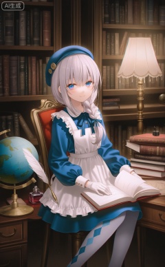 1girl,book,solo,blue eyes,hat,bookshelf,globe,sitting,braid,chair,open book,painting (medium),pantyhose,smile,argyle clothes,long hair,argyle legwear,traditional media,quill,watercolor (medium),library,desk,apron,dress,lamp,holding,grey pantyhose,looking at viewer,grey hair,inkwell,indoors,lantern,hair over shoulder,beret,gloves,long sleeves,