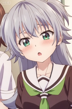 long hair, blush, open mouth, multiple girls, brown hair, 2girls, jewelry, school uniform, green eyes, flower, serafuku, two side up,loli