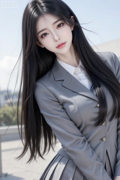 最高画质,长焦镜头,年轻气质美女,皮肤白皙,高质量,绝世美人,户外,jk制服,柔顺长发,灰色西装,百褶裙,皮肤白皙,摆着pose。